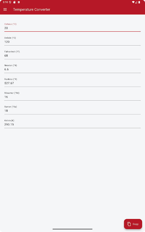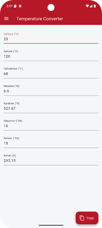 Konwerter temperatury to wszechstronna i przyjazna dla użytkownika aplikacja, która pozwala bez wysiłku konwertować temperatury między ośmioma różnymi skalami temperatur: Celsjusza (°C), Delisle'a (°De), Fahrenheita (°F), Newtona (N), Rankine'a (°R ), Réaumur (°Ra), Romer (°Rø) i Kelvin (K).
