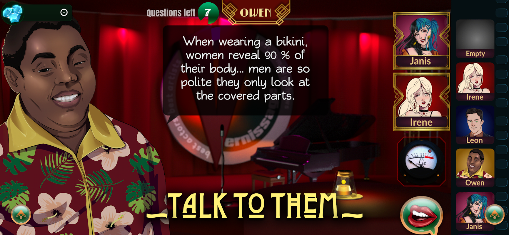 Przygotuj się na interakcję z ponad dziesięcioma postaciami! To, jak do nich podchodzisz, jakie pytania zadajesz, zależy wyłącznie od Ciebie. Pamiętaj tylko, że niektóre z nich mogą być zbyt niebezpieczne, by zadać pytanie, więc zachowaj trzeźwość umysłu. Wynik tego dochodzenia zależy wyłącznie od Ciebie!