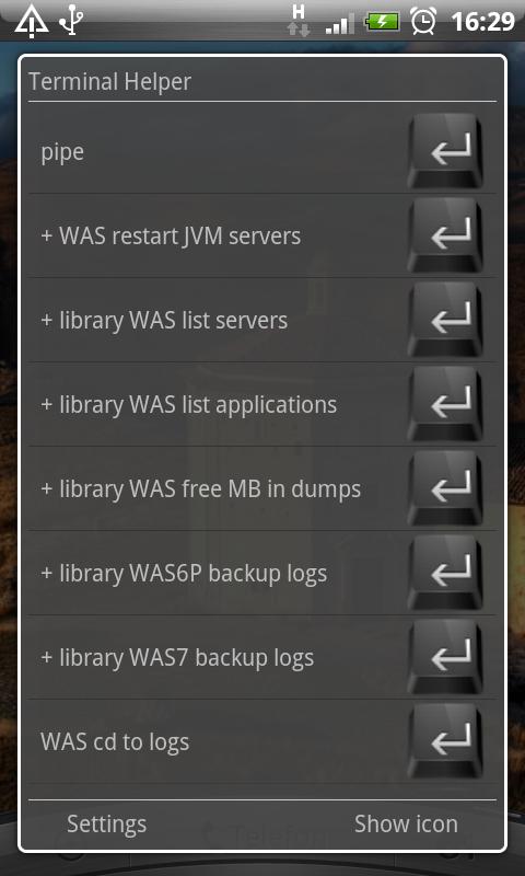 DO NOT USE ENTER in Command! This application is designed to help people working with SSH/ConnectBot/Terminal applications with possibility paste something into it. You can make list of often used long commands here and then map Terminal Helper to some shortcut key on your keyboard, and pick any of these commands just with one click to your clipboard. Also, you can use word #customString# somewhere in your command line (so many times, as you wish), and Terminal Helper will ask you for replacement every time before copying command to clipboard. More information and complete guide on website.