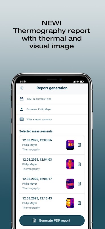 - Wydajnie: Twórz cyfrowe raporty pomiarowe wraz ze zdjęciami w postaci plików PDF/CSV na miejscu i wysyłaj je pocztą elektroniczną.