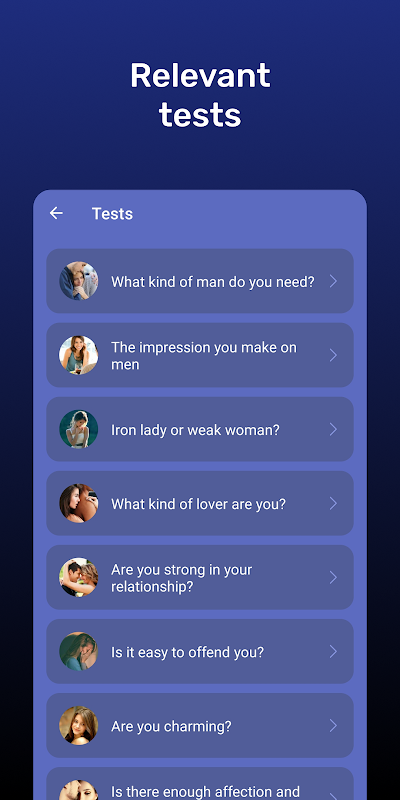 Aplikacja zawiera zbiór testów psychologicznych. Zawiera zarówno profesjonalne testy psychologiczne, jak i rozrywkę. Możesz nauczyć się wielu interesujących cech swojej osobowości lub innej osoby. Każdy test zawiera opis. Znajdziesz test dla każdego smaku i dla każdej osoby.