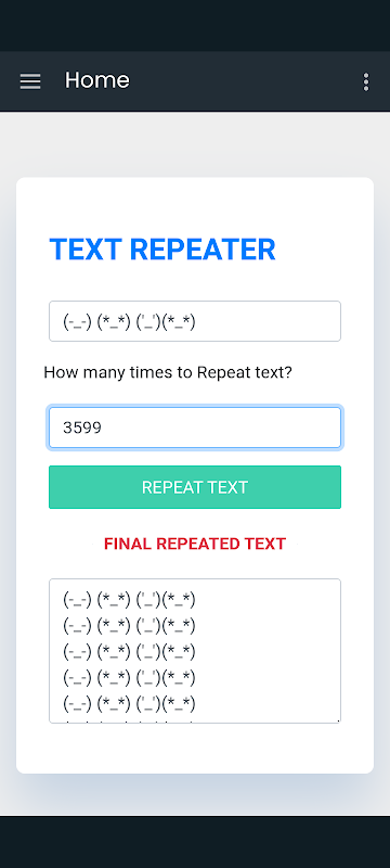 Are you bored from typing repeating text? Message and Text Repeat how many times you want, just Write or paste it and choose the number time to repeat.