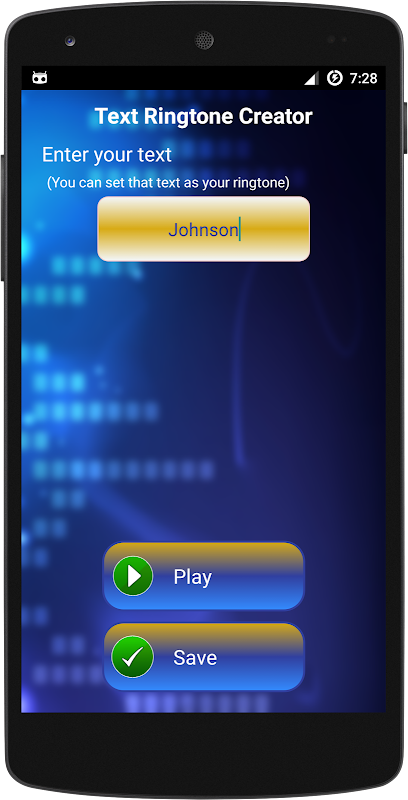 > Now you can create unique ringtone with this free application. You can play the tone for test and you can save with this application, Text Ringtone Creator. This app will create your name ringtone. If you would like to create your name or your beloved ones name then it become easy to create and set as ringtone.