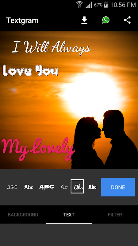 In the menu FILTER Textgram - Text on Photos, you can filter your text that you created with beautiful filter. Very easy to use, only click on the filter that you want and you can see the applied filter instantly.
