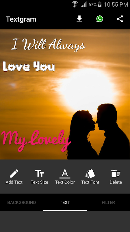 • You can save your image to your gallery with click download icon on top menu Textgram - Text on Photos apps. The saved image will be shown on you gallery and you can find the saved file in folder \Pictures\Textgram.
