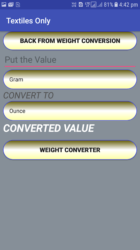 Aplikacja TextilesOnly została zaprojektowana w celu ułatwienia obliczeń. Jest to przydatne dla studentów tekstylnych, początkujących tekstyliów. Aplikacja jest bardzo prosta w użyciu. W aplikacji następujące obliczenia są podane-