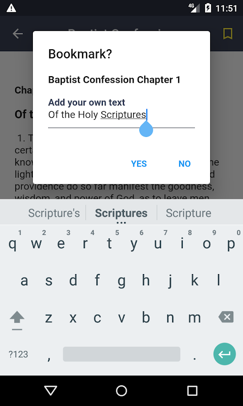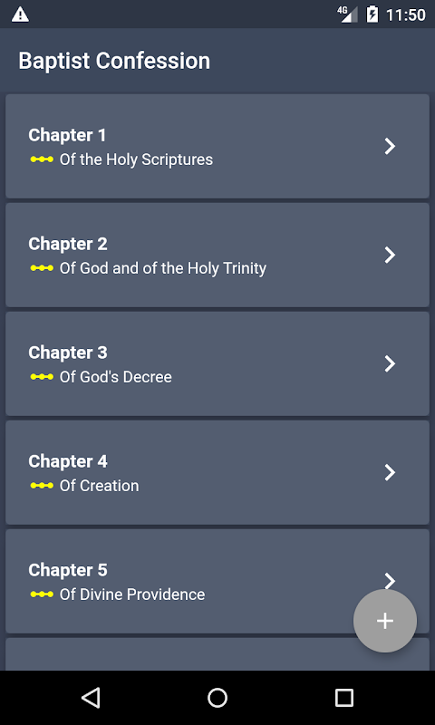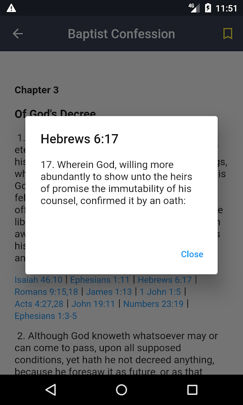 This app contains the full text of the 1689 Baptist confession of Faith, plus a system of pop-up scripture references, which, as far as I know, is unique among Android confessional apps. The scripture references are off-line, and use the "Updated King James Version". Once the app is installed, no network connection is required. The latest version now includes bookmarks.