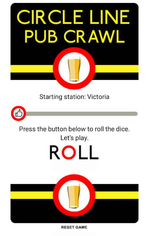 The idea behind the Circle Line Pub Crawl app is simple, complete a lap of the Underground's Circle Line in a clockwise direction. This is achieved by rolling a dice to work out how many stations you must travel before disembarking the tube and heading up to street level to have a drink.