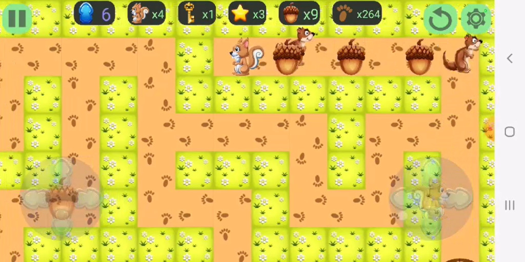 Poruszając się po labiryncie, możesz zbierać żołędzie. Mając żołędzie, możesz rzucać nimi w inne zwierzęta, aby je nakarmić.