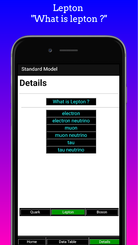 Aplikacja zawiera symbol, typ, masę, ładunek, spin, rok odkrycia, generację i wiele innych informacji o cząstkach elementarnych.