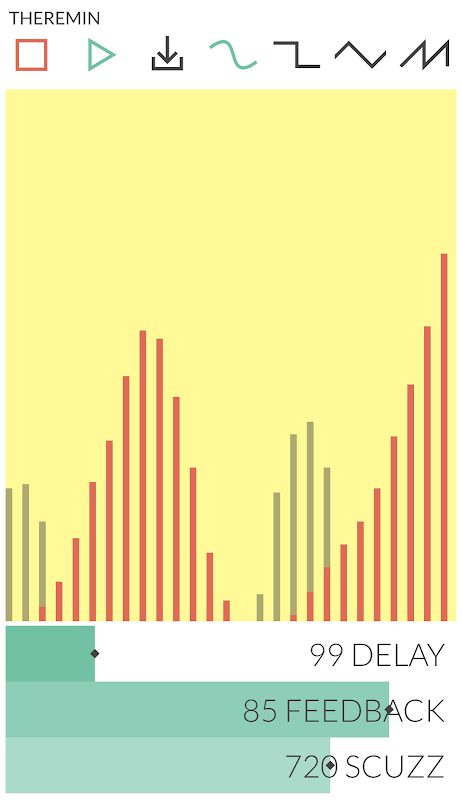 Jest to przyrząd synth multitouch. Zagraj to dotykając i przesuwając ekran, zmieniając przebiegi i przesuwając skutki stworzyć coś od tradycyjnego sci-fi Theremina dźwięki do głębokich scuzzy dźwięków. Za pomocą elementów sterujących Looper do nagrywania, pętli i Overdub warstwach. Następnie, jeśli chcesz zapisać lub udostępnić nagranie, naciśnij przycisk pobierania, aby wysłać plik wav do innych kompatybilnych aplikacji, takich jak Wiadomości, E-mail, Dropbox itp