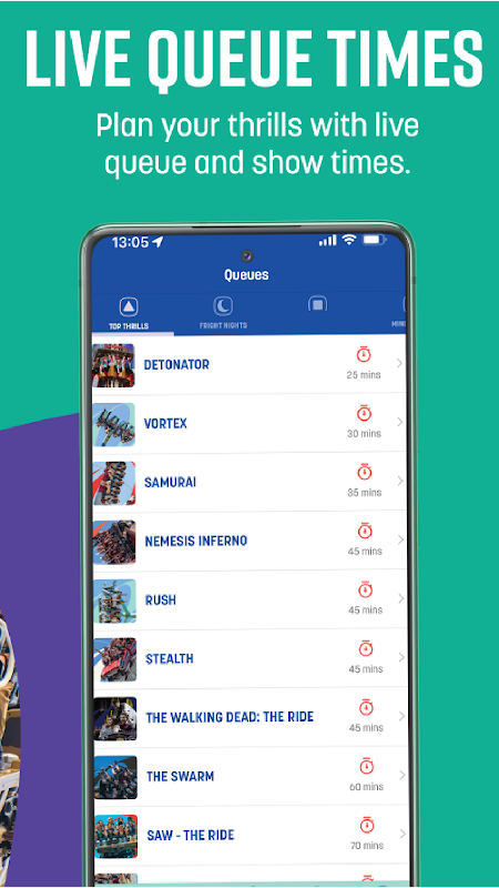 Oficjalna aplikacja Thorpe Park Resort została przeprojektowana, aby Twoja wizyta była jeszcze lepsza. Dzięki naszej bezpłatnej aplikacji do pobrania będziesz mógł: