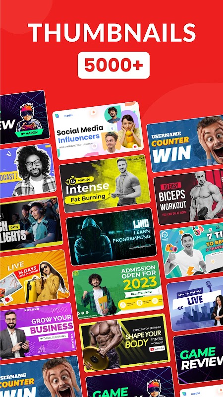 Aplikacja do oznaczania miniatur — narzędzie do tworzenia banerów służy do tworzenia miniatur, grafik kanałów i banerów z miniaturami do Twoich filmów w najpiękniejszy sposób, aby Twój przekaz był jasny i wyróżniał się z tłumu. Aby korzystać z tej aplikacji do projektowania miniatur, nie są potrzebne żadne umiejętności projektanta. Tej aplikacji do tworzenia miniatur można używać jako narzędzia do tworzenia grafiki kanałów lub projektowania banerów. Możesz także łatwo utworzyć niestandardową miniaturę, zatrudniając projektanta miniatur za pośrednictwem naszej aplikacji.