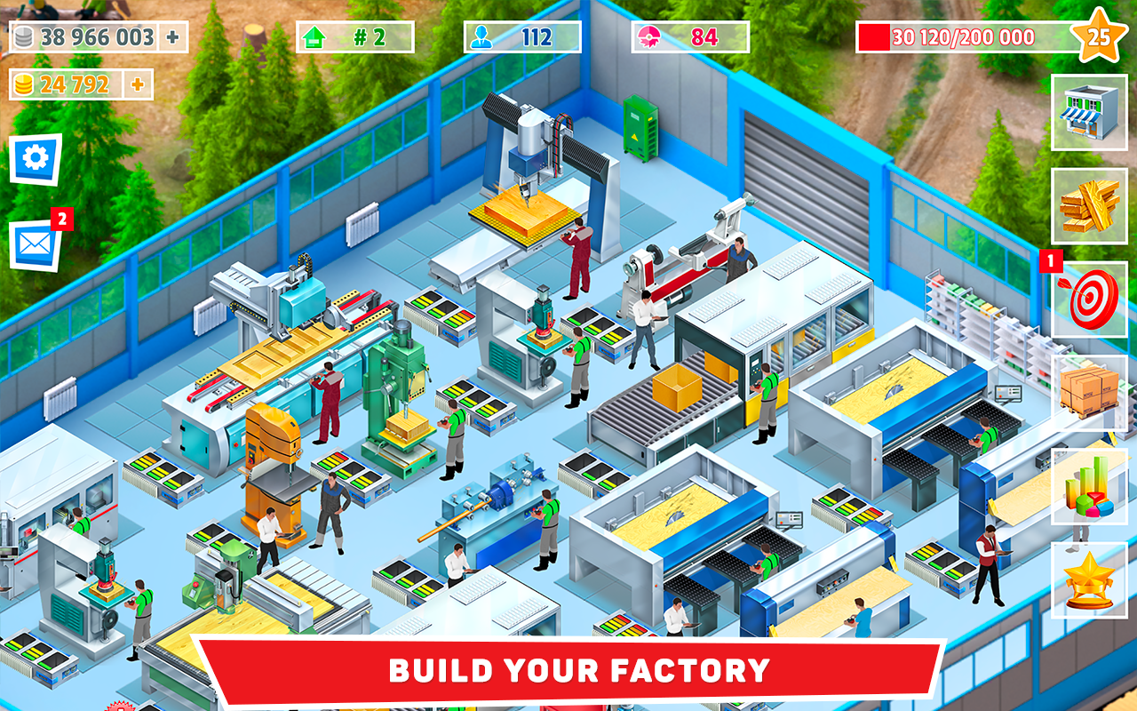 Strategia zarządzania fabryką. Zbuduj i rozbuduj dużą fabrykę obróbki drewna! Kup sprzęt, zatrudnij pracowników i rozpocznij produkcję. Prowadź operacje ostrożnie i automatyzuj procesy produkcyjne. Twoi pracownicy będą pracować nawet po zamknięciu gry!