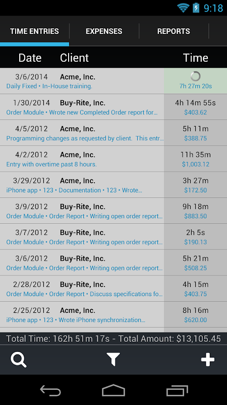 Time Master może śledzić zarówno czas, jak i wydatki. Możesz śledzić czas za pomocą godzin rozpoczęcia i zakończenia, czasu trwania i/lub timerów. Wszystkie wpisy czasu są śledzone dla jednego dnia, więc wpisy czasu nie mogą być dłuższe niż 24 godziny. Pozwoli ci to na rozłożenie czasu na kilka dni, na przykład, jeśli rozpoczniesz pracę o godzinie 20:00. i zakończyć o 2 w nocy, będzie trwać 6 godzin.