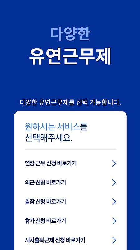 언제 어디서나 모바일로 간편하게 근무관련 사항(연장근로, 휴가, 출장, 외근)을 신청하고 근로 내역을 조회할수 있습니다.