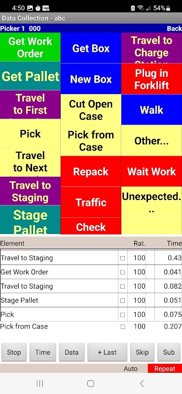 For fast paced warehouse time studies display rating and quantity keypads on the data collection screen to speed data collection and allow you to keep up with the job.