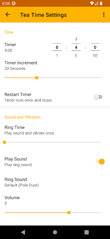 Tea Time ma również kilka dostępnych opcji, do których można uzyskać dostęp za pośrednictwem ekranu aplikacji lub dwukrotnego dotknięcia widżetu. Możesz ustawić czas za pomocą suwaka, który jest szybszy niż przyciski, lub ustawić, jak szybko przyciski zwiększają licznik. Ty wybierasz dźwięk, głośność i jak długo dzwoni, gdy minutnik się włącza. Możesz także zmienić kolor i przezroczystość tła i tekstu.