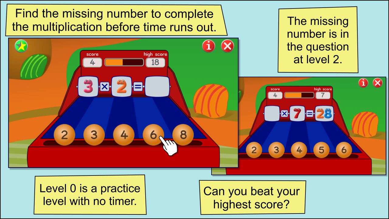 You can set which multiplication tables to use in the activities - either a single table when learning a particular table or a number of tables for more general practice.
