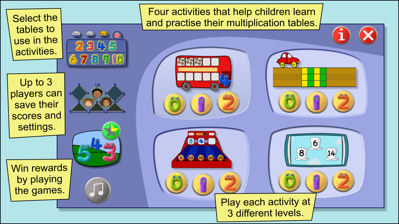 Four activities help children learn and practise their times tables. Each level has its own help screen outlining how the activity works and briefly describing some of the educational opportunities it provides.