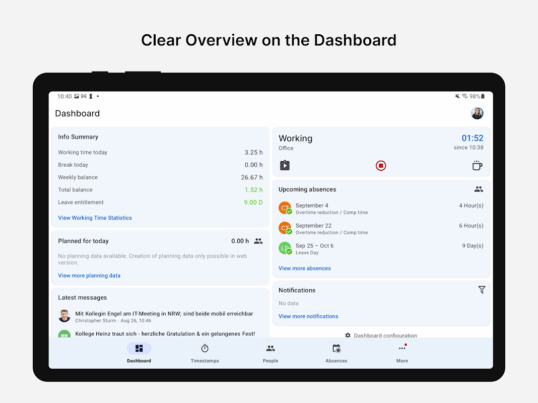 Kto obecnie pracuje nad jakim zadaniem, jest nieobecny, pracuje dzisiaj zdalnie lub z biura? W przeglądzie statusów możesz zobaczyć na bieżąco czas pracy i nieobecności pracowników. Jest to szczególnie interesujące dla menedżerów i ułatwia zarządzanie czasem zespołów.