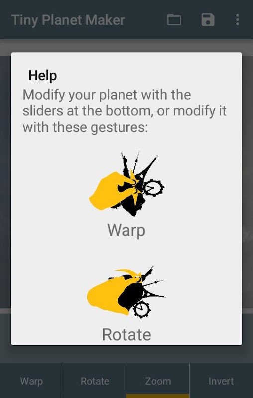 Tiny Planet Maker można tworzyć na podstawie 360 strzałów lub normalnych zdjęć pięknych Tiny planet. Wystarczy otworzyć obraz aplikacji lub podziel go przez inną aplikację. Zmień swoją planetę za pomocą suwaków lub gestów dotykowych. Aplikacja nie może nagrywać Fotots sobie istniejące zdjęcia są przetwarzane z nią. Tiny Planet efekt znany jest również jako mała planeta, Little Planet, Globephoto lub stereograficznym projekcji.