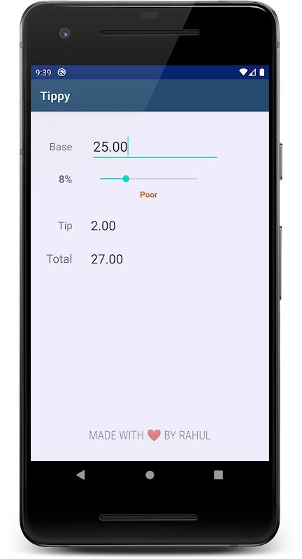 Tippy to prosty kalkulator napiwków stworzony do celów edukacyjnych, w 100% darmowy i open-source. Po wprowadzeniu kwoty bazowej i procentu napiwku aplikacja obliczy napiwek i sumę za Ciebie. Wprowadzamy również animację procentową napiwków i stopkę, aby nasza aplikacja była bardziej wyjątkowa.