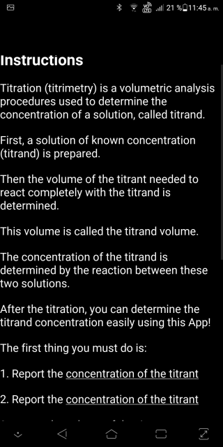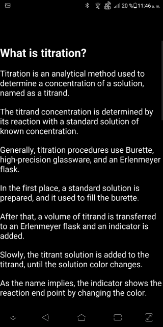 Miareczkowanie jest szeroko stosowaną procedurą analityczną. Jednak nadal jest to trudny temat dla wielu studentów i profesjonalistów. W tym kierunku aplikacja ta ułatwia naukę koncepcji miareczkowania, a także oferuje narzędzie do wykonywania niezbędnych obliczeń analitycznych.