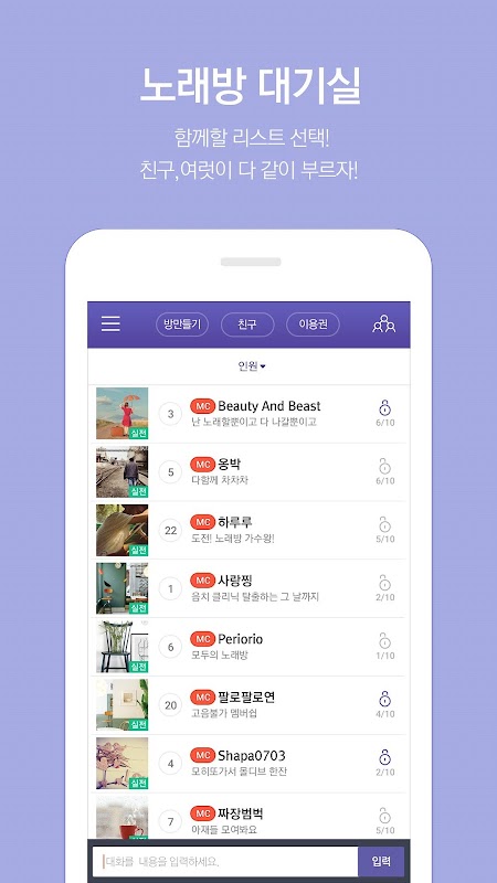 ▶ 대기실에서 원하는 방을 선택하거나 방을 만들어 노래를 부르거나 듣고 이야기도 할 수 있습니다.