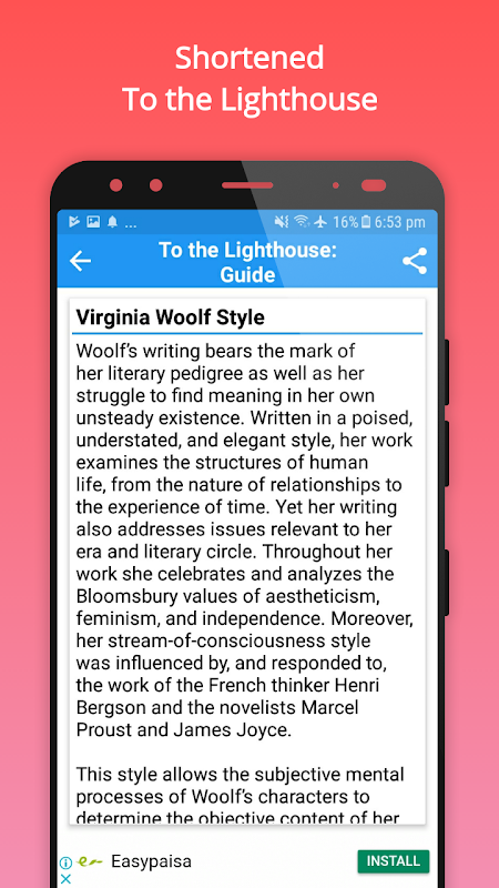 This Guide app works both online and offline, and contains 32 basic topics about one of the famous novels of Virginia Woolf, To the Lighthouse.