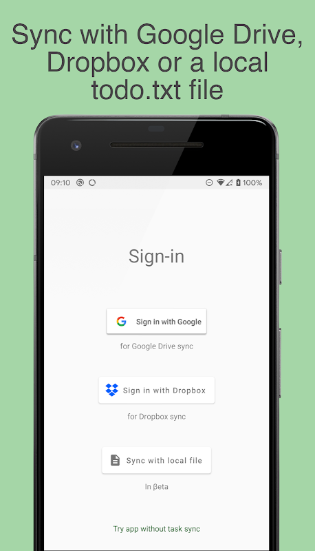 Prosty menedżer zadań wspierany przez plik todo.txt, którego jesteś właścicielem i kontrolujesz. Synchronizuje się z Dyskiem Google, Dropbox lub plikami lokalnymi.