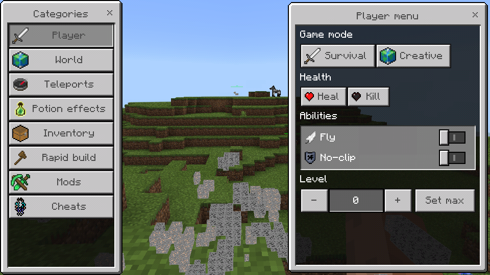Toolbox is a launcher/modification for Minecraft: PE (MCPE) that allows you to give yourself items (just like in the popular Too Many Items modification), potion effects, change gamemode, set health, time, weather, enchant items, spawn, remove or set health of all entities of a certain type, see valuable blocks using a special mode called X-Ray, and much more!