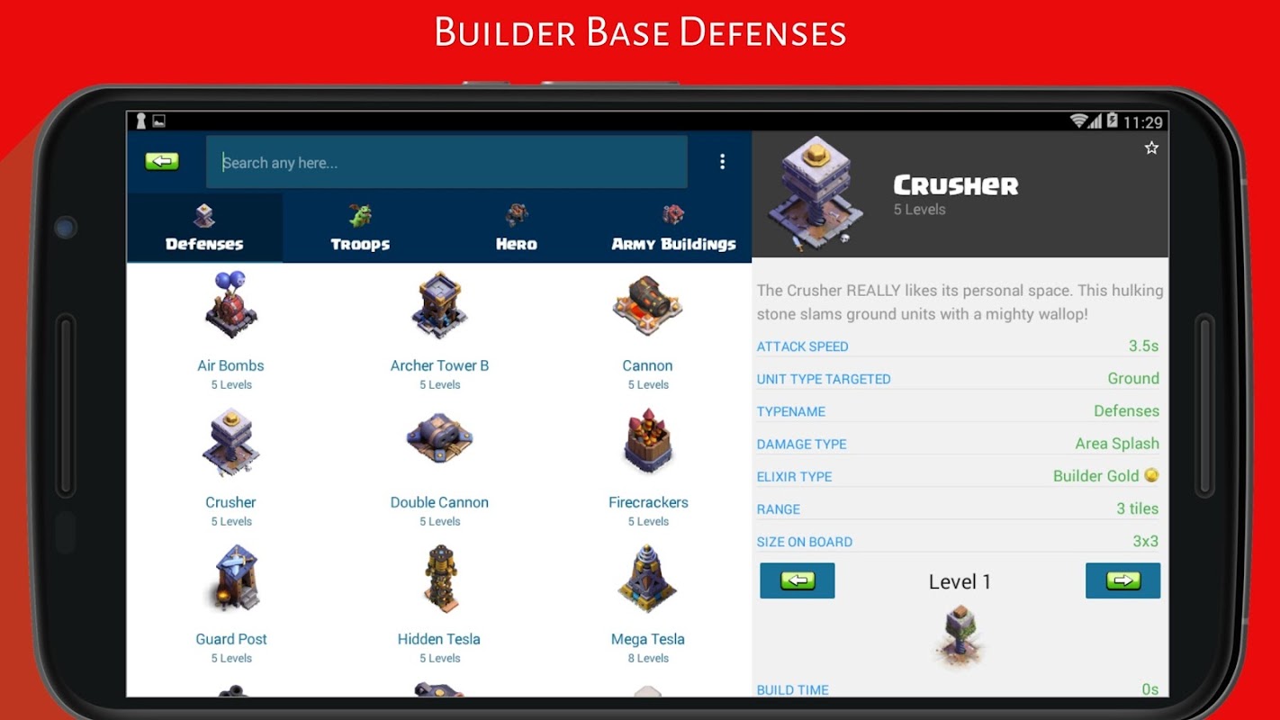 Need to know how much the new lab upgrade with cost? We have you covered. Want to know what town hall you get level 6 Wizards or level 5 Barbarians? We have you covered. With the addition of the Clash of Clans info section you can answer this and much more. A very convenient way to get all the information for your Clash of Clans village. All buildings, troops, spells, traps and heroes are all laid out in an easy to read format so that when you have a question on upgrade or future hit points or anything you can get the answer quickly.
