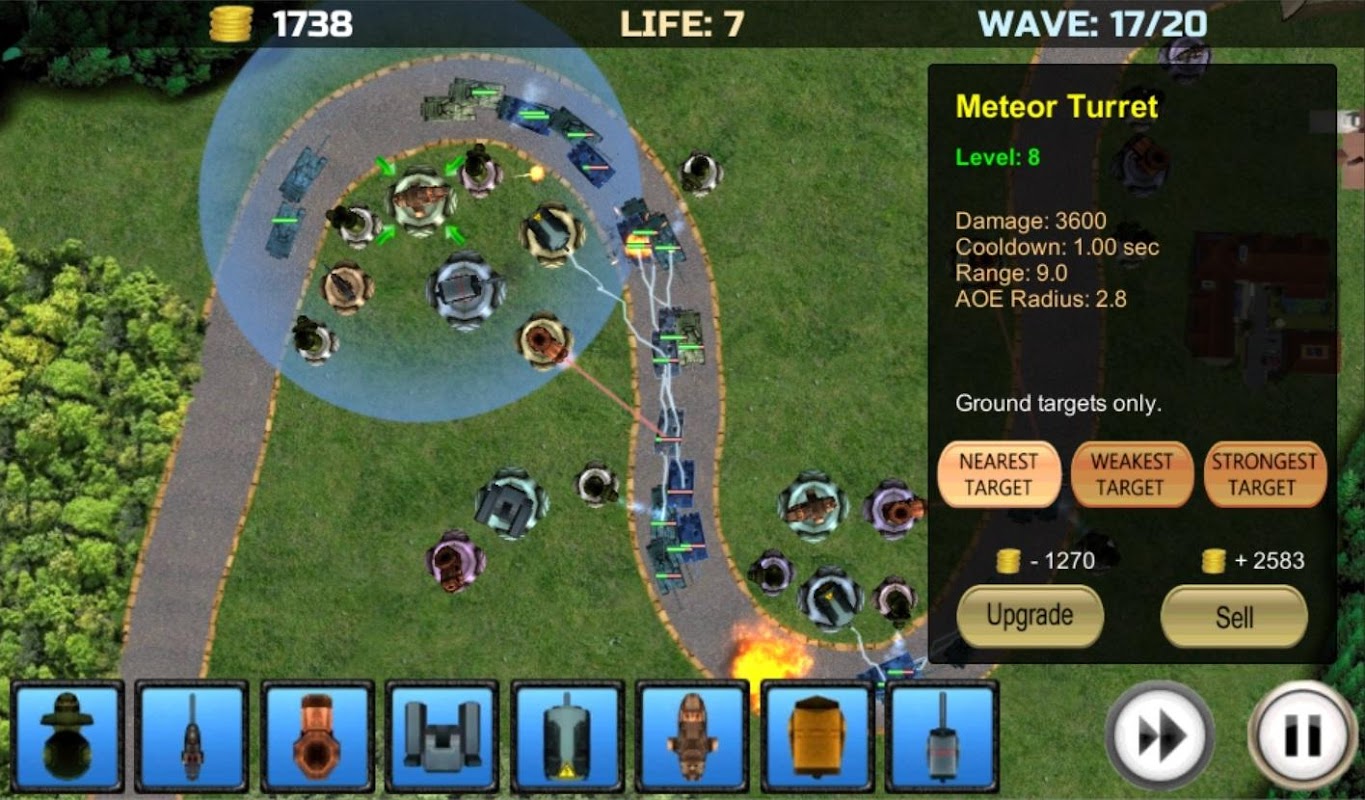 Możesz zmienić priorytet dla każdej wieży (najbliższy, najsłabszy lub najsilniejszy cel).