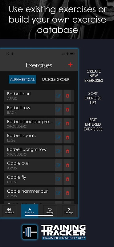 The design of Training Tracker’s interface makes it simple to navigate. A few exercises and simple workouts come preloaded in the app for use. You can use them as they are or edit them to fit your needs. This apps interface allows you to easily enter your own exercises. You can give them any name you like and use them to build your own custom workouts based on your typical gym routine, or any new routine you would like to log and track.
