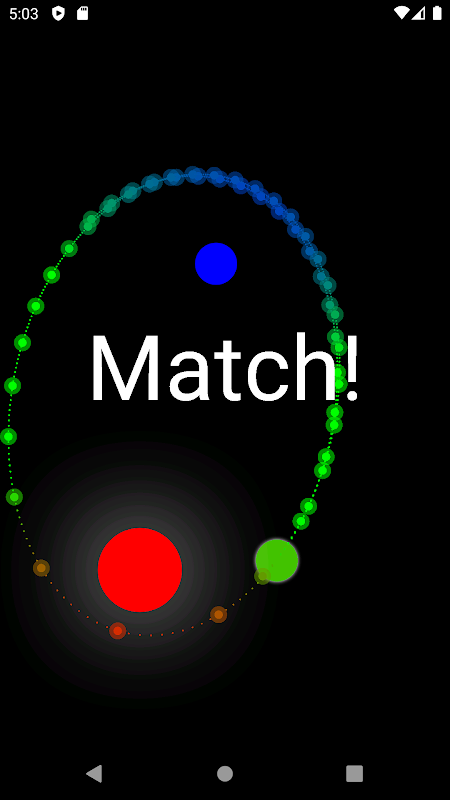 Dotknij ekranu i przesuń, aby przesunąć kule. Zaobserwowano przewidywaną trajektorię w czasie rzeczywistym. Zwróć uwagę na kolor trajektorii: wskazuje on, jak blisko jest do czerwonej i niebieskiej kuli. Zwróć również uwagę na rozmiar i jasność kul: jest to związane z siłą grawitacji.