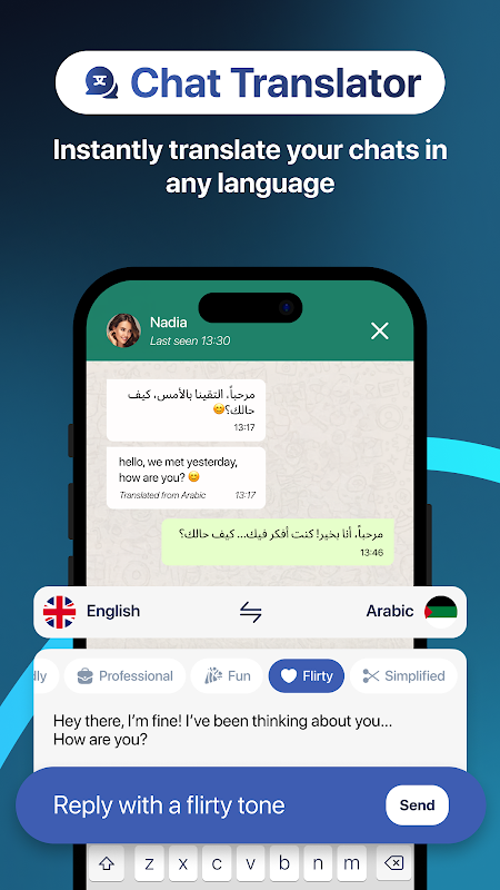 1. Błyskawiczne Tłumaczenie Czatu: Nasza klawiatura tłumacząca pozwala na natychmiastowe tłumaczenie rozmów bez uciążliwego przełączania się między aplikacjami. Po prostu wpisz tekst, kliknij, a zostanie on natychmiast przetłumaczony bezpośrednio z klawiatury.