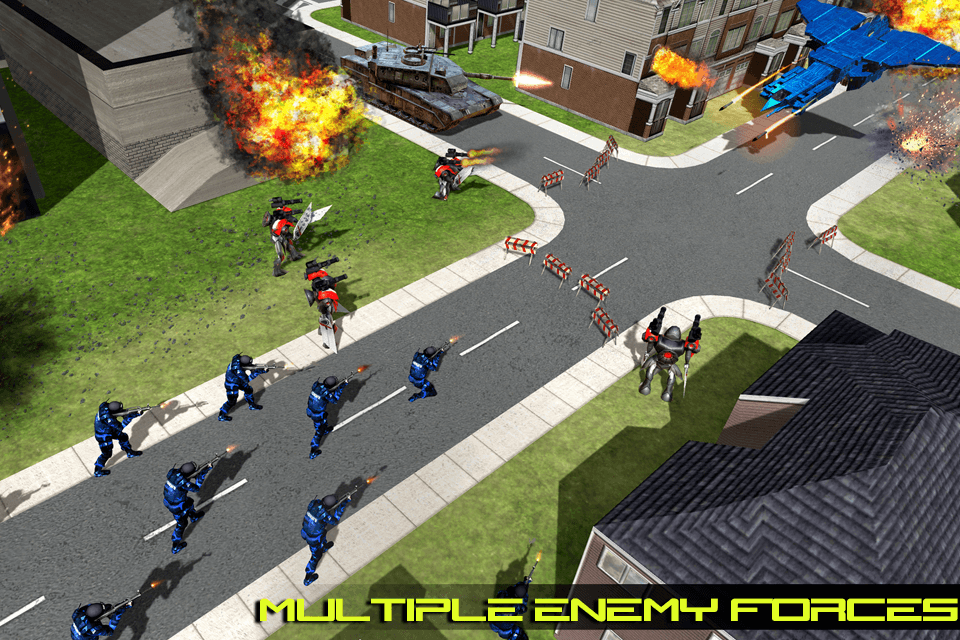 The evil commander of rival forces have invaded the city and are taking over land base. Desperate times require desperate measures. Take control of war tank robot that are loaded with explosive weapons to defend the battlefield by destroying the deadly monster machines on land.