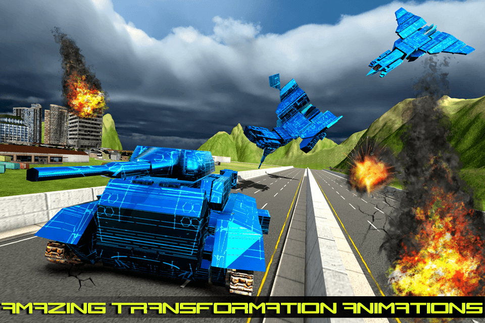 The epic war of the century has begun and we need the ultimate battle machines to win. Unleash the deadly future robots that can transform into any military weapon and bring havoc and destruction over the enemy. Take control of this flying robots & battle tank in Transform Robot Action Game; Fight for glory, victory and success!