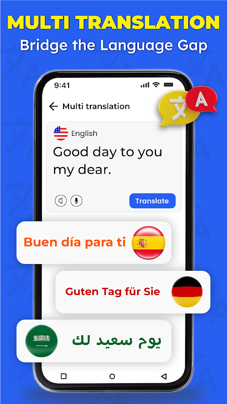 Tłumacz wielojęzyczny i mowy, umożliwia łatwe tłumaczenie językowe poprzez mówienie. Jeśli jesteś na zagranicznej wycieczce, nie musisz się martwić i po prostu skorzystaj z bezpłatnego tłumacza. to funkcja Mów i tłumacz szybko tłumaczy wymowę słów w lokalnym języku.
