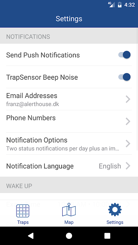 Dzięki tej aplikacji można łatwo zainstalować i skonfigurować swoje jednostki TrapSensor. Można edytować który należy przesyłać adresy e-mail i numery telefonów powiadomień. Dodatkowo, można ustawić czas dla codziennych powiadomień. Codzienne komunikaty powiadomień podsumować stan wszystkich pułapek w jednej wiadomości.