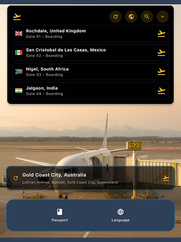 Przeglądaj setki miast i krajów za pomocą naszego interfejsu tablicy odlotów. Każdy cel podróży wyświetla lokalne informacje w czasie rzeczywistym, w tym pogodę, strefy czasowe i odległość od Twojej bieżącej lokalizacji. Skorzystaj z naszego zaawansowanego systemu wyszukiwania i filtrowania, aby znaleźć miejsca docelowe według kontynentu, klimatu, atrakcji lub odkryć ukryte perełki dzięki funkcji losowego wyboru celu podróży.