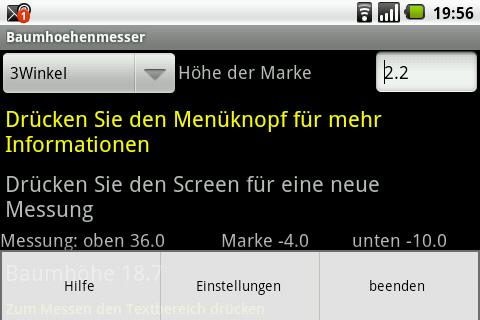 Uruchom aplikację i najpierw wybierz procedurę. Metodą 3Winkel musisz najpierw zawiesić znak na mierzonym drzewie lub umieścić na nim patyk pomiarowy. To powinno być tak wysokie, jak to możliwe. Zmierz znacznik wysokości za pomocą linijki i wprowadź wartość w polu tekstowym. Następnie poszukaj lokalizacji, z której wyraźnie widać drzewo do zmierzenia. Trzymaj telefon w taki sposób, aby można było jednym okiem skierować wąski długi bok urządzenia i kolejno zmierzyć górę drzewa, markę i łodygę. Pomiar jest uruchamiany za każdym razem, gdy naciśniesz ekran pod tekstem.