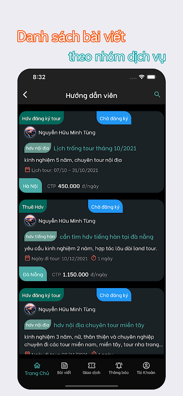 - Tài khoản: Đăng ký tài khoản qua số điện thoại, xác thực OTP tin nhắn. Mỗi tài khoản sẽ chọn lĩnh vực Du lịch mà mình hoạt động để đăng bài, nhận thông báo các tin liên quan.