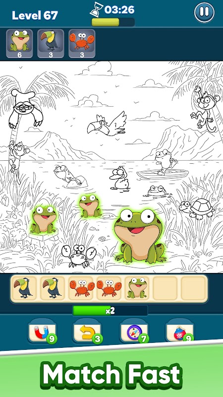 W sumie jest 6 płytek. Jeśli wypełnisz wszystkie płytki, przegrywasz grę. Celem jest znalezienie i dopasowanie trzech zwierząt tego samego rodzaju na kafelkach.