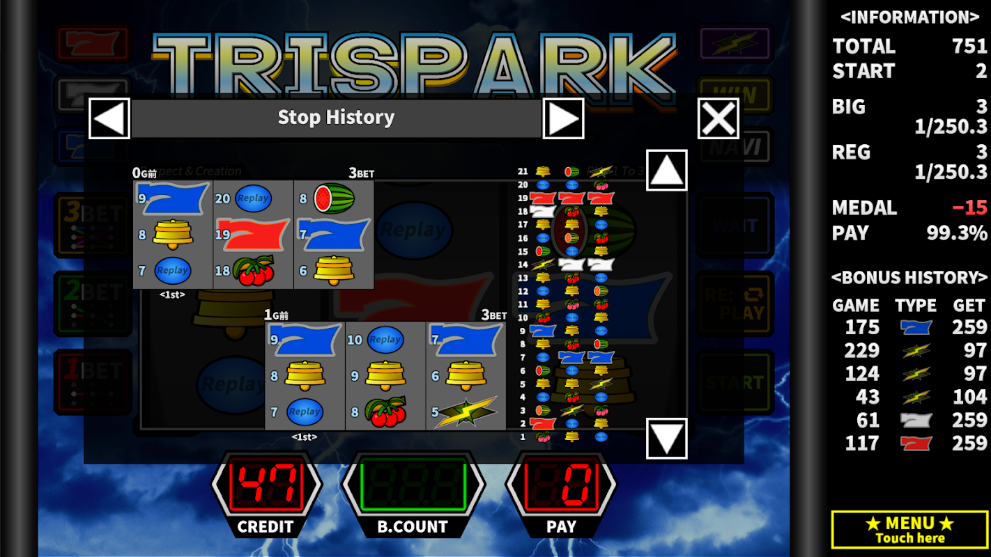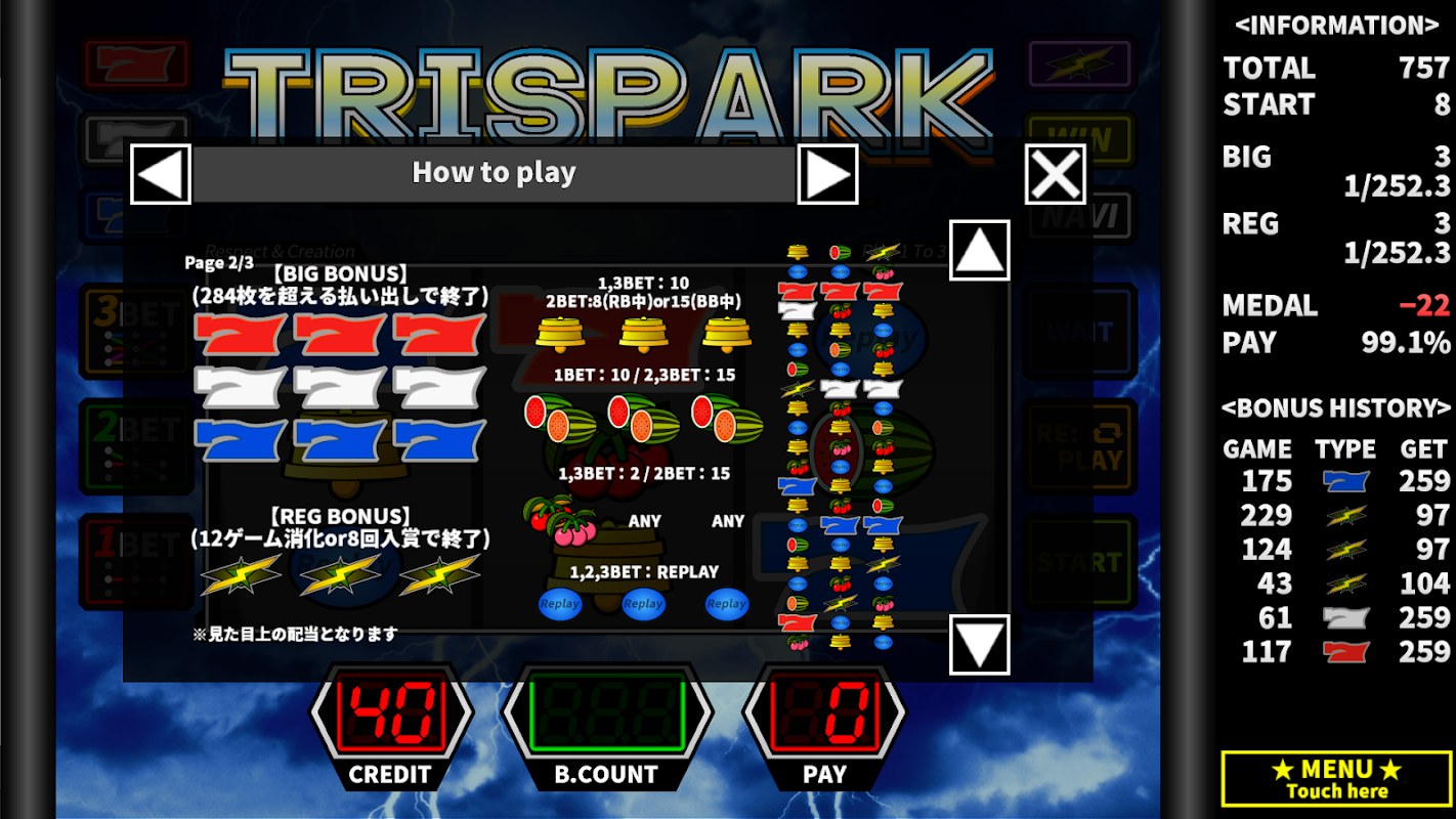 Jest to oryginalna aplikacja slotowa typu A "TriSpark", która szczególnie dotyczy sterowania bębnem. Chociaż jest oryginalny, ma następujące funkcje i możesz go doświadczyć tak, jak na prawdziwej maszynie.