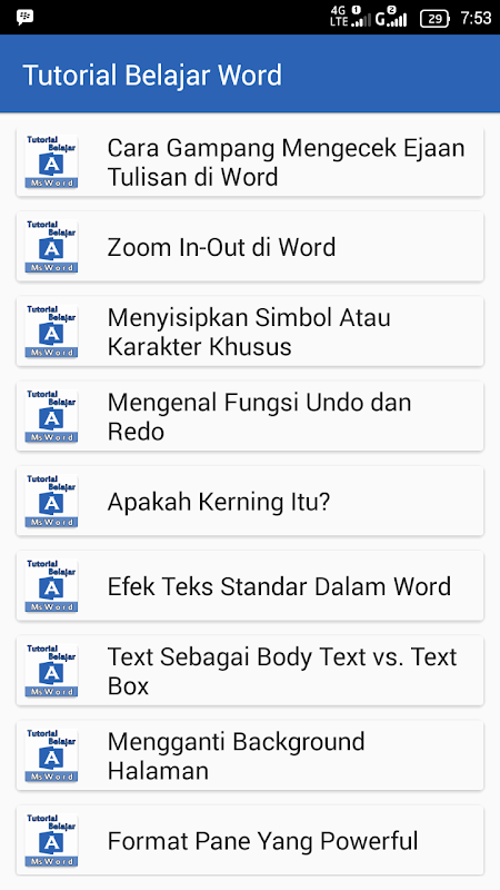 Aplikacja Tutorial Nauka Słowo to aplikacja, która dostarcza materiał poradnik MS Word przy użyciu indonezyjski. Ta aplikacja jest idealny dla swoich pracowników i uczniów / studentów, którzy często są związani z zadaniem tworzenia dokumentów roboczych, dokumentów i innych wymagań pisania. W tej aplikacji, będziesz uczył jak łatwo tworzyć szeroką gamę dokumentów wykorzystujących MS Word.