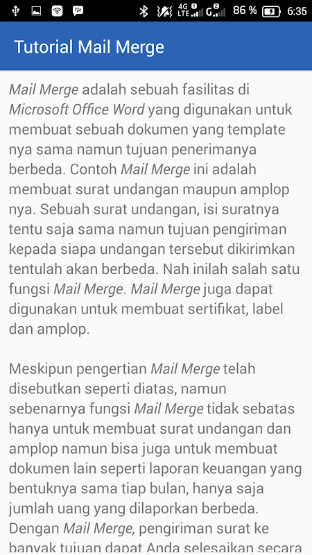 Jest mnóstwo materiału przedstawione w niniejszym Słowo Uczenie Tutorial App. Począwszy od podstawowego poziomu materiału takiego jak wpisując słowa do materiału tylko jako biegły poziomie jak utworzyć korespondencję seryjną. Więc dla tych z was, którzy nadal leżał na Słowie i chcą się uczyć MS Word, to nie powinien wahać się pobrać tę aplikację, ponieważ będzie uczył tutorial MS Word poziom podstawowy krok po kroku aż do osiągnięcia biegłości.