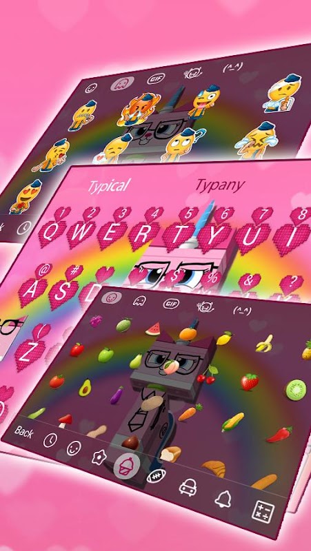 • New Free Typany Pink Brick Unicorn keyboard theme will bring to your keyboard & text input a real new looks & feel. Check this FREE personalized design for your Typany emoji Keyboard right now!