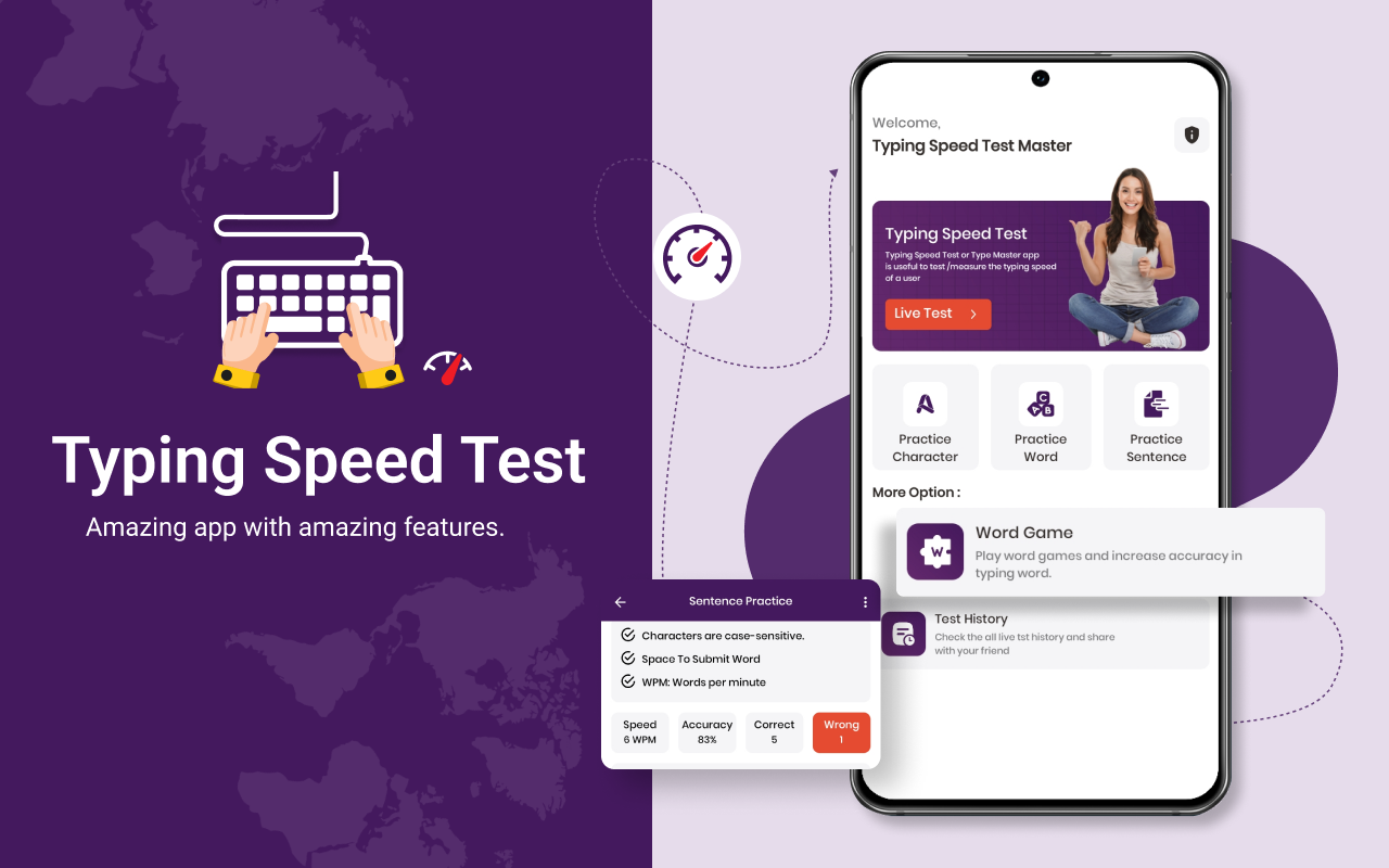 Najlepsza aplikacja do testowania szybkości pisania z fajnymi wyzwaniami do testowania szybkości. Rozwiąż test ze znajomymi i zobacz, kto pisze najszybciej. Używamy licznika czasu i inteligentnego algorytmu, który poda dokładny wynik, podejmie wyzwanie ze znajomymi lub po prostu poprawi szybkość pisania. Regularne korzystanie z tej aplikacji może poprawić szybkość pisania. Wybierz mały i duży akapit podany tutaj, abyś mógł codziennie poprawiać szybkość pisania.